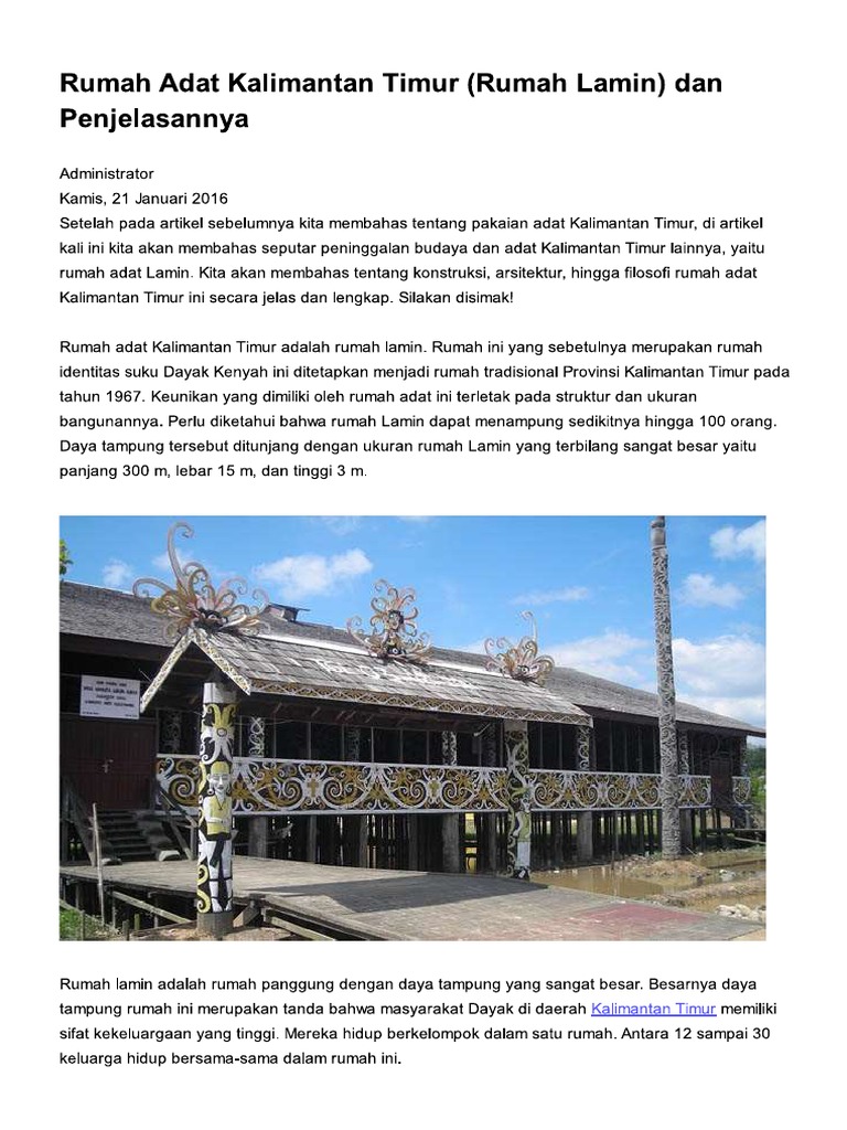 Rumah lamin merupakan rumah adat yang ditinggali oleh masyarakat asal kalimantan timur dengan panjang sekitar 300 meter, lebar 15 meter, dan tinggi kurang lebih 3 meter. Nah apa saja keunikan rumah adat lamin khas kalimantan timur. Keunikan yang dimiliki oleh rumah adat ini terletak pada struktur dan ukuran bangunannya. Rumah lamin berntuk layaknya seperti rumah dayak panjang, dan rumah bentang. Rumah adat lamin merupakan rumah adat terbesar yang ada di indonesia. Panjang rumah lamin dapat mencapai 300 meter dengan lebar 15 meter dan tinggi kurang lebih 3 meter. Ciri khas rumah gadang adalah mempunyai keunikan dalam bentuk arsitekturnya dengan atap yang. Provinsi sulawesi utara rumah tambi mempunyai kelainan dan keunikan tersendiri, karena kerangka bagian atas rumah (tiang. Keunikan rumah adat lamin yang terletak di kalimantan timur menarik untuk diulas pada kesempatan ini. Rumah lamin ini mempunyai keunikan yang membuatnya berbeda dengan rumah adat nusantara lainnya. Rumah daerah maluku utara adalah sasadu, tipenya rumah panggung dengan keunikan jumlah pintu yang ada sebanyak 6 pintu. Lamin adalah rumah adat suku dayak di kalimantan timur. Dibangun hanya dengan kayu dan lalang, diaman.